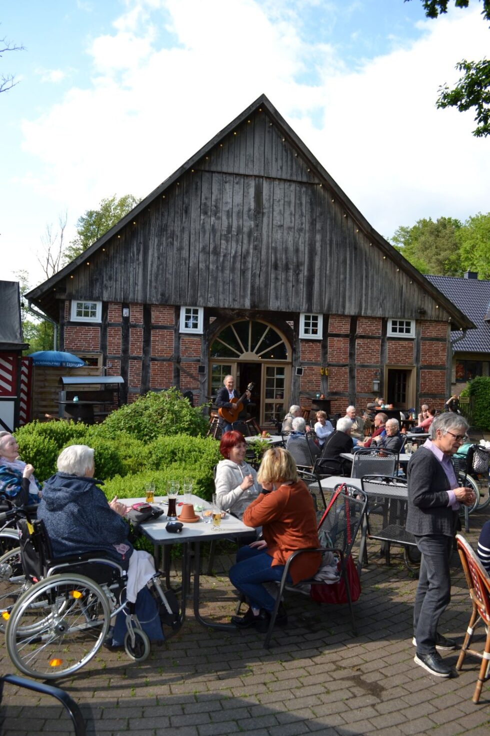 Die Terrasse mit Gartenmöbeln schließt direkt an unsere Cafeteria an. Bei guter Witterung kann man Kaffee und Kuchen also auch gerne ins Freie verlagern. Oder man setzt sich einfach in die Sonne, schließt für einen Moment die Augen und lauscht dem beruhigenden Klang des Springbrunnens…